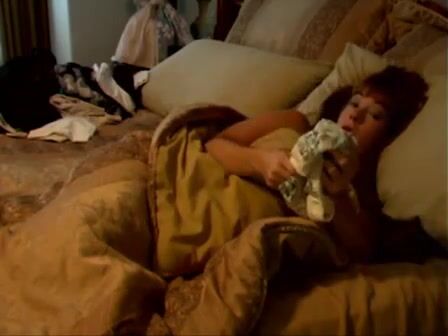 Redhead wife is naked on the bed tempting husband with her tits. She then masturbates that hairy pussy of hers.