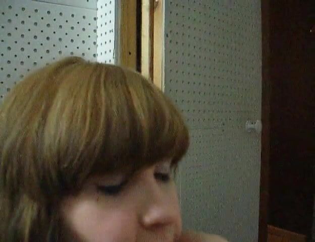 Naughty girlfriend is naked in the bathroom showing her small tits. She is down on her knees and blows bf's cock.